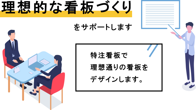 店舗ロゴ・イラスト製作も対応し、デザイン・企画提案・製作・据付まで自社一貫対応でスピーディー・高品質を実現します。また、看板許可申請にも対応し、スムーズな納品が可能です。